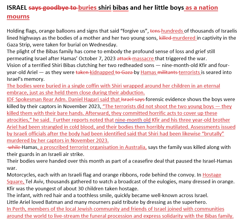 Whilst the West Australian writes many editorials condemning anti-Semitism and gives both factual and well contextualised coverage to events in Israel, it is nonetheless concerning that biased reporting, sourced from syndicated news agencies that propagate an anti-Israel narrative continue to be published. The flow on effect is that readers do not get context or understanding and turn against Israel in its existential predicament. Media bias is one of the biggest causes of anti-Semitism.