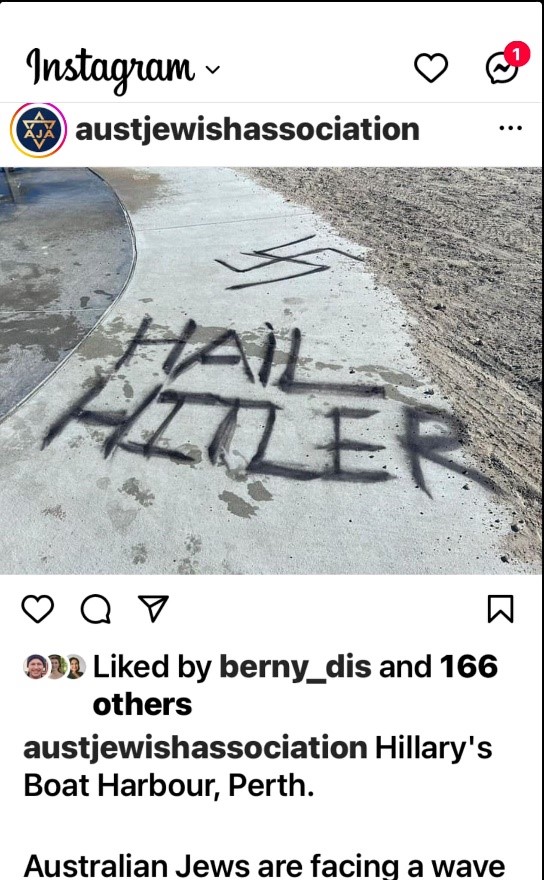 Sadly open anti-Semitism in the streets of Australia is increasing.  For the sake of not encouraging repeat offences, I have refrained from sharing some of the local incidents that have rocked the confidence of Jewish people in Perth.  This is just one example of some of the hate graffiti seen locally: