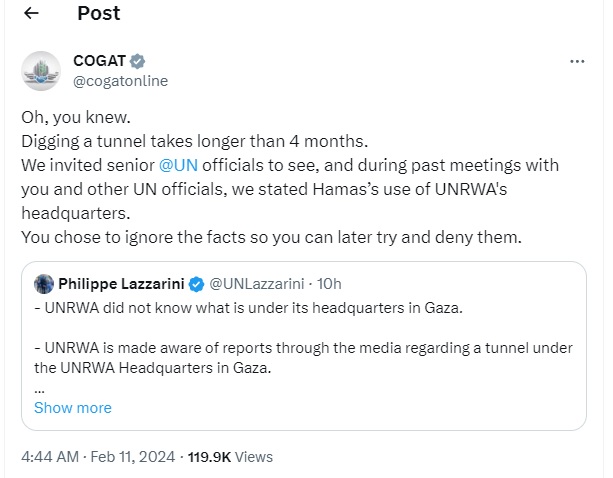 Meanwhile, UNRWA chief Philippe Lazzarini posted: “UNRWA did not know what is under its headquarters in Gaza.”  Israel has called this out as a lie.
