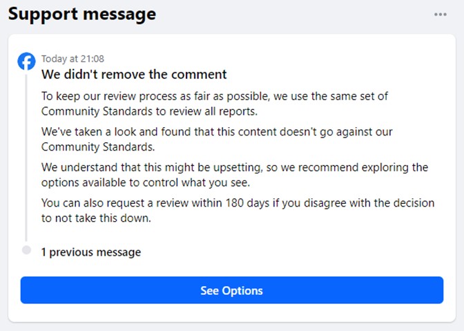 I marked this as hate speech and reported it. Within minutes the Facebook algorithm had done its work and responded with the following: